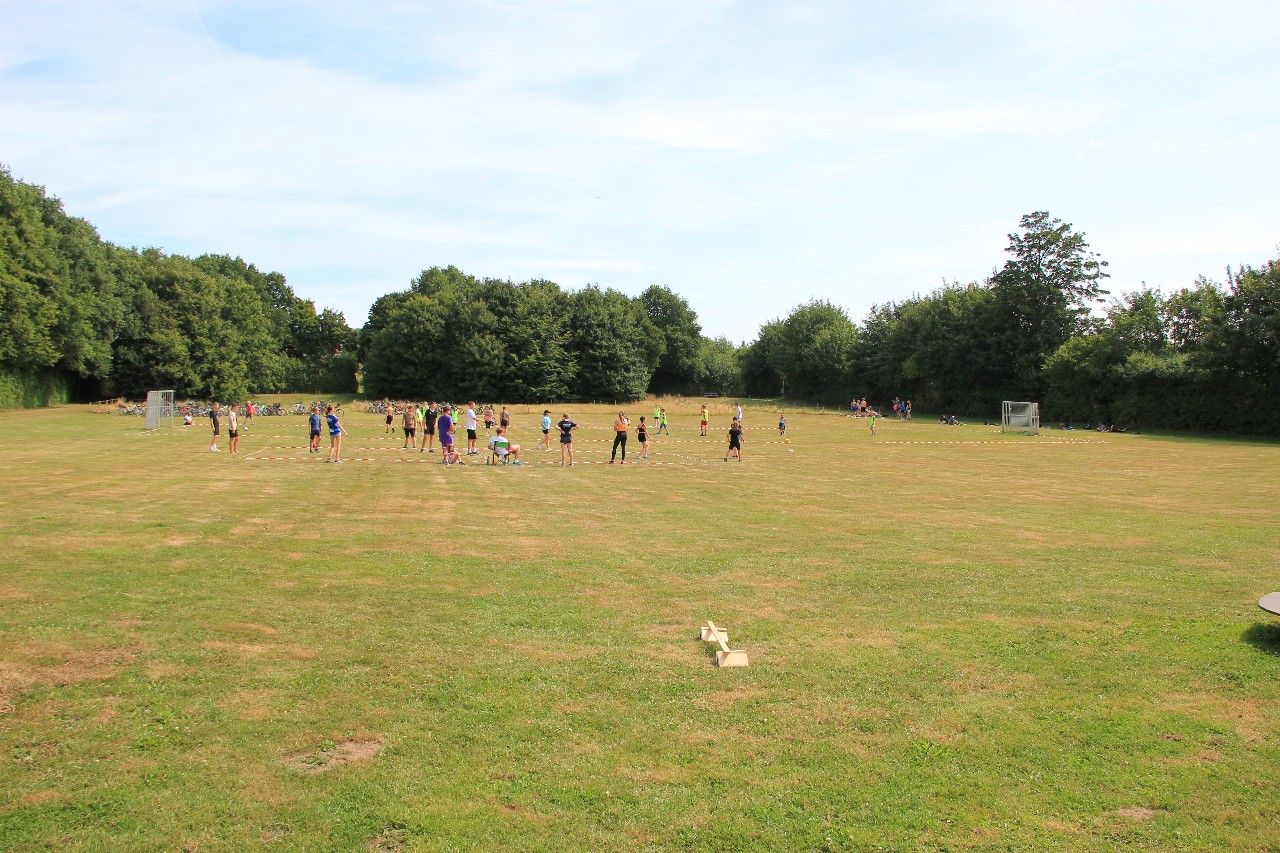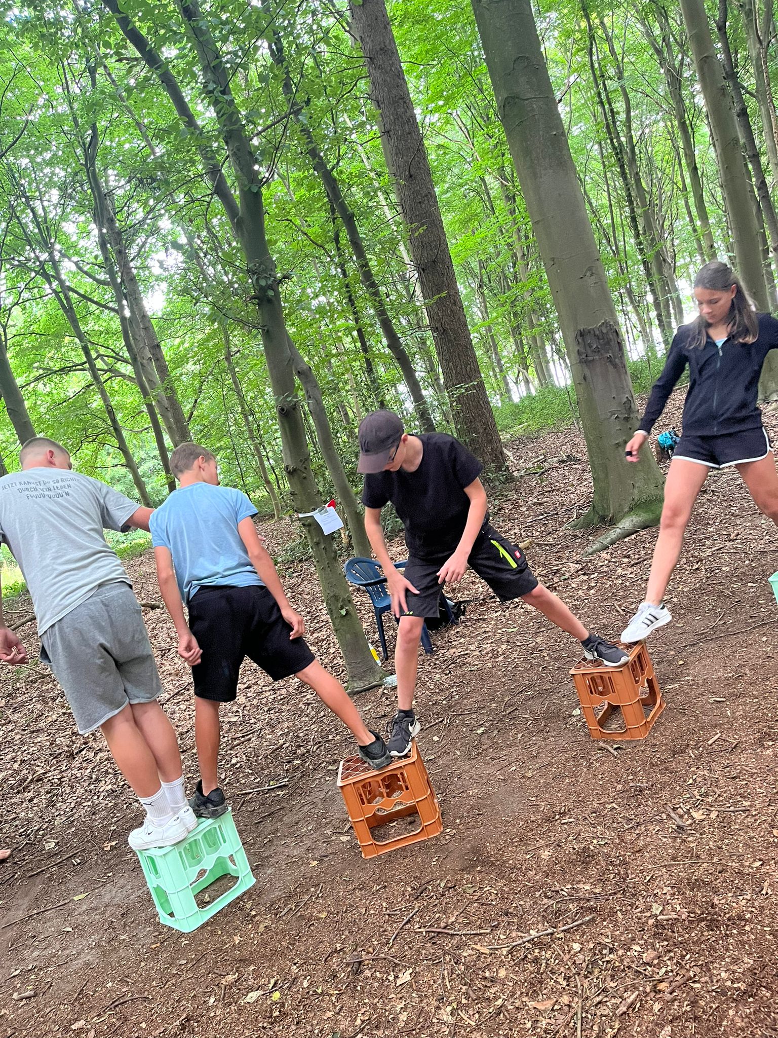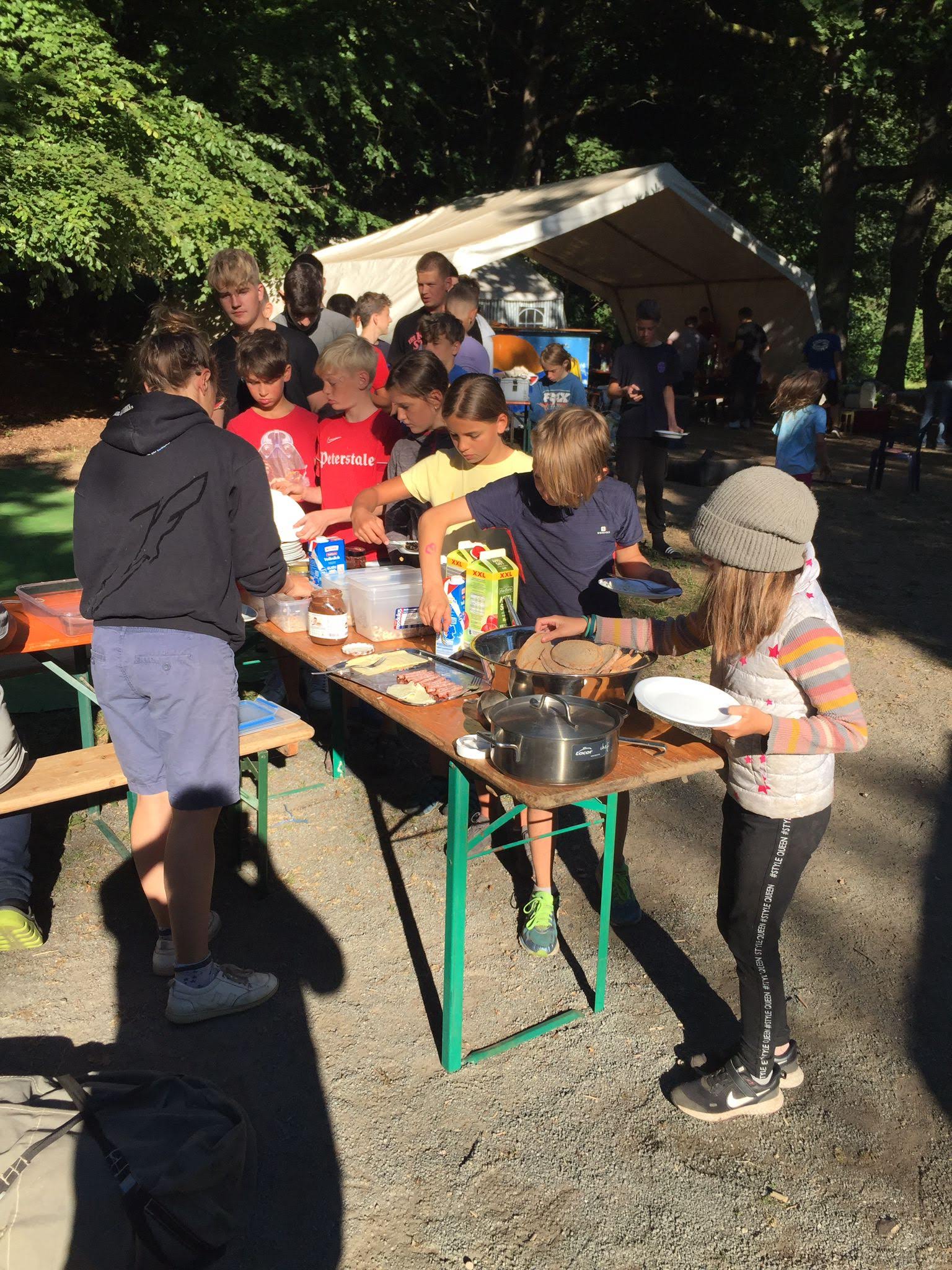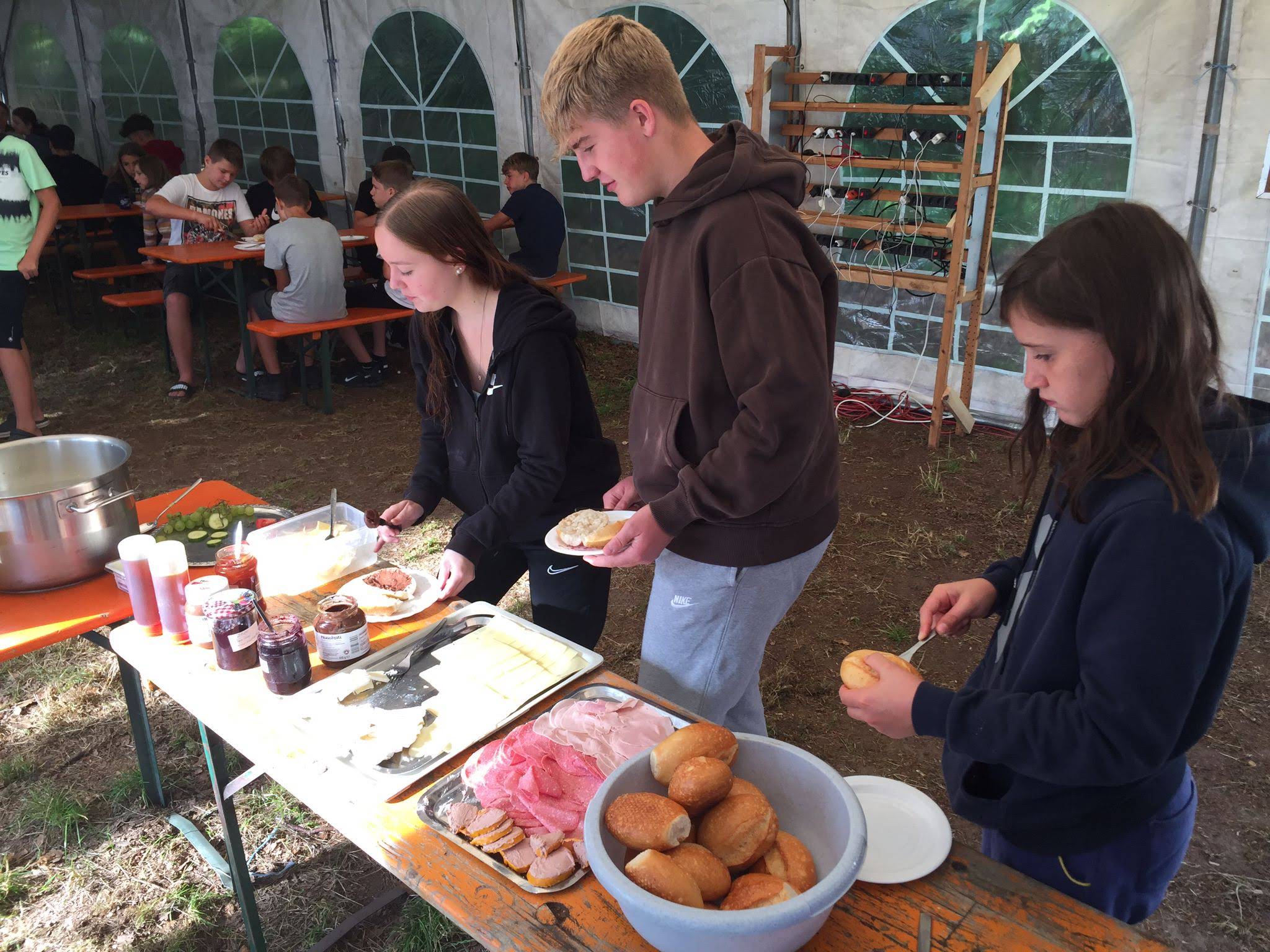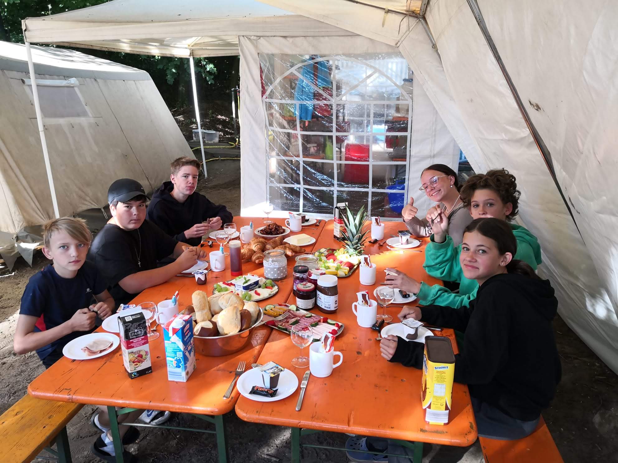 Heute Morgen wurden wir um 7:15 Uhr mit lauter Musik geweckt. Anschließend gab es leckeres Frühstück. Danach sind wir 10 Minuten mit dem Fahrrad auf eine große Wiese gefahren. Wir haben über den Vormittag einen Sportag gemacht. Hierbei haben wir Fußball, Völkerball und Minispiele gespielt! Das war lustig und schön. Als wir gegen 13:15 Uhr am Zeltplatz waren, gab es gleich Bauernfrühstück. Es hat sehr lecker geschmeckt.
