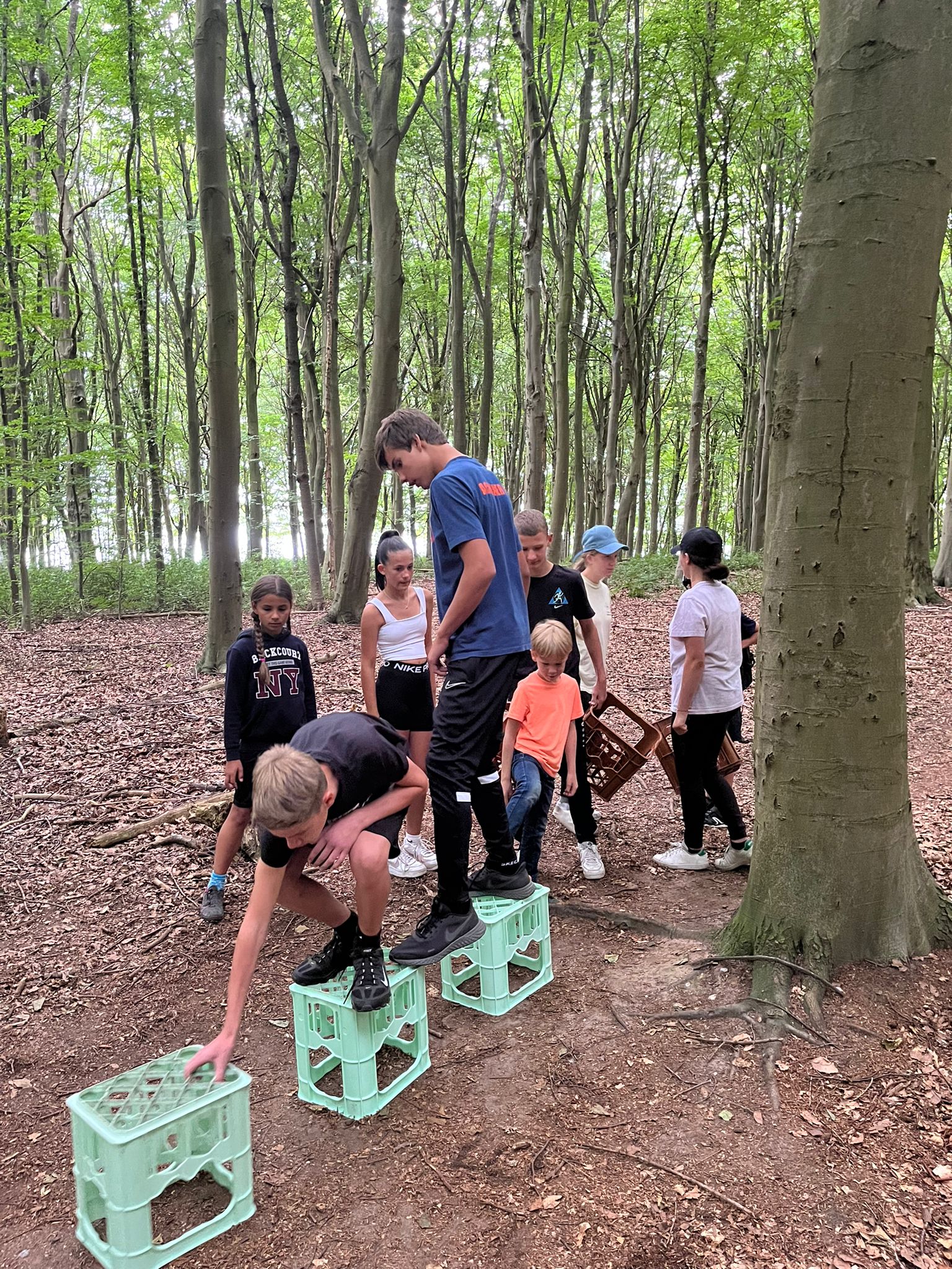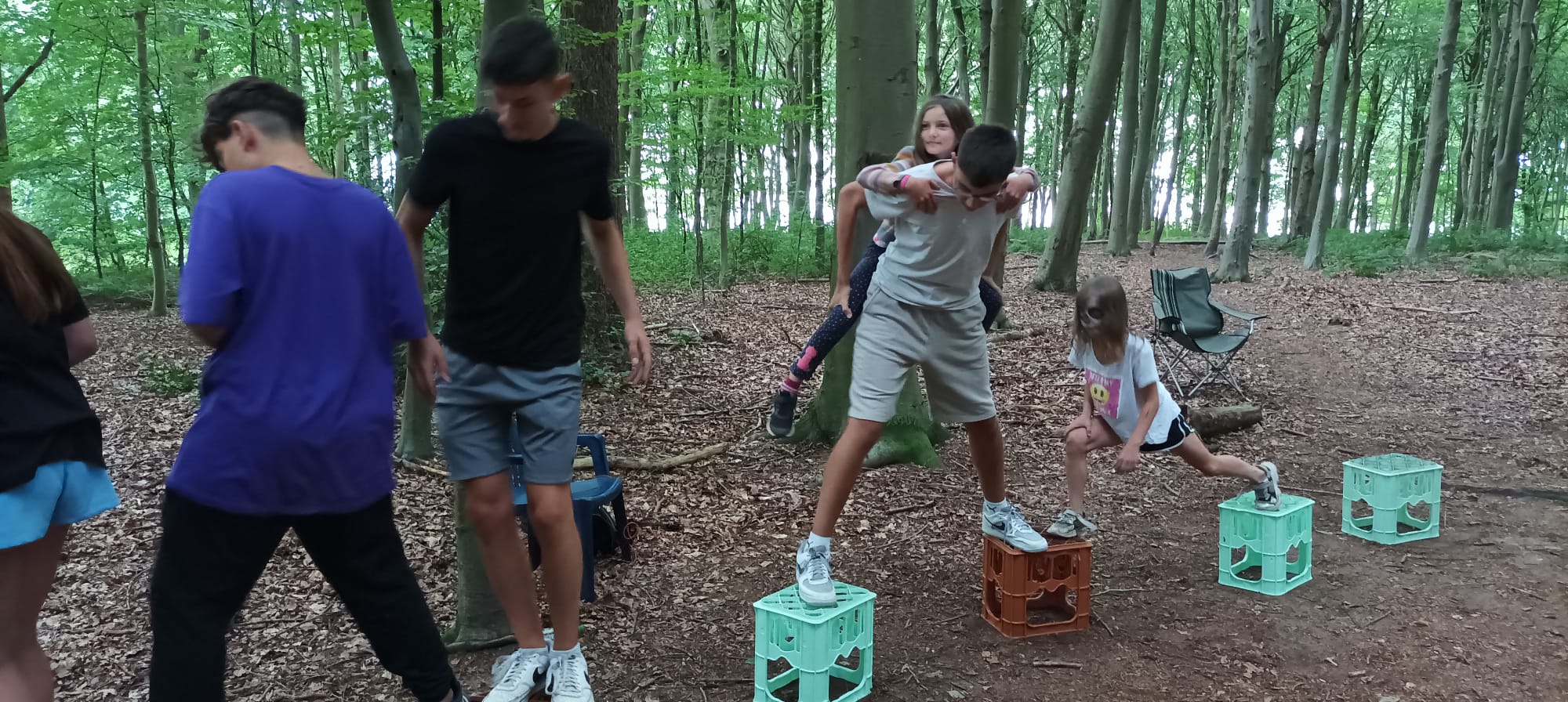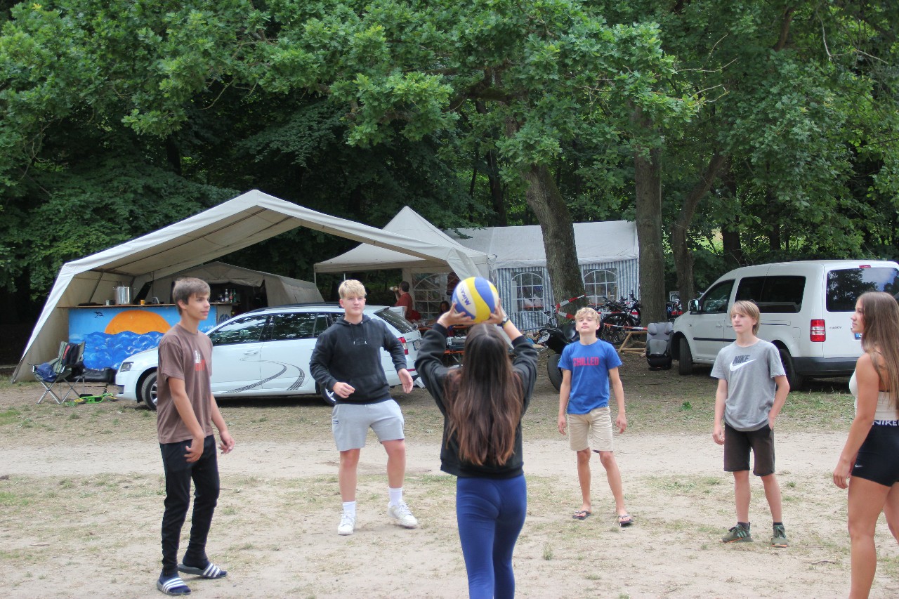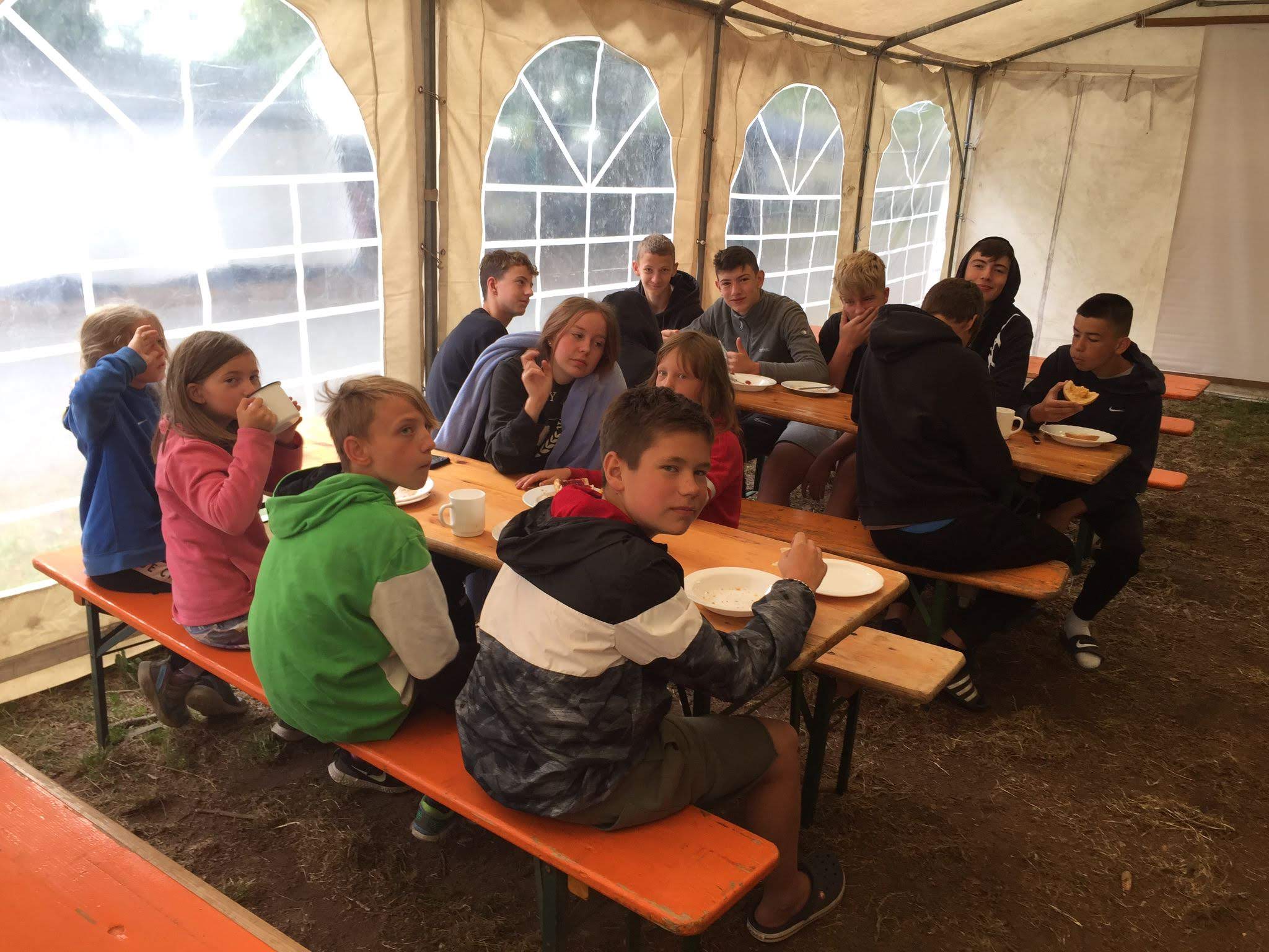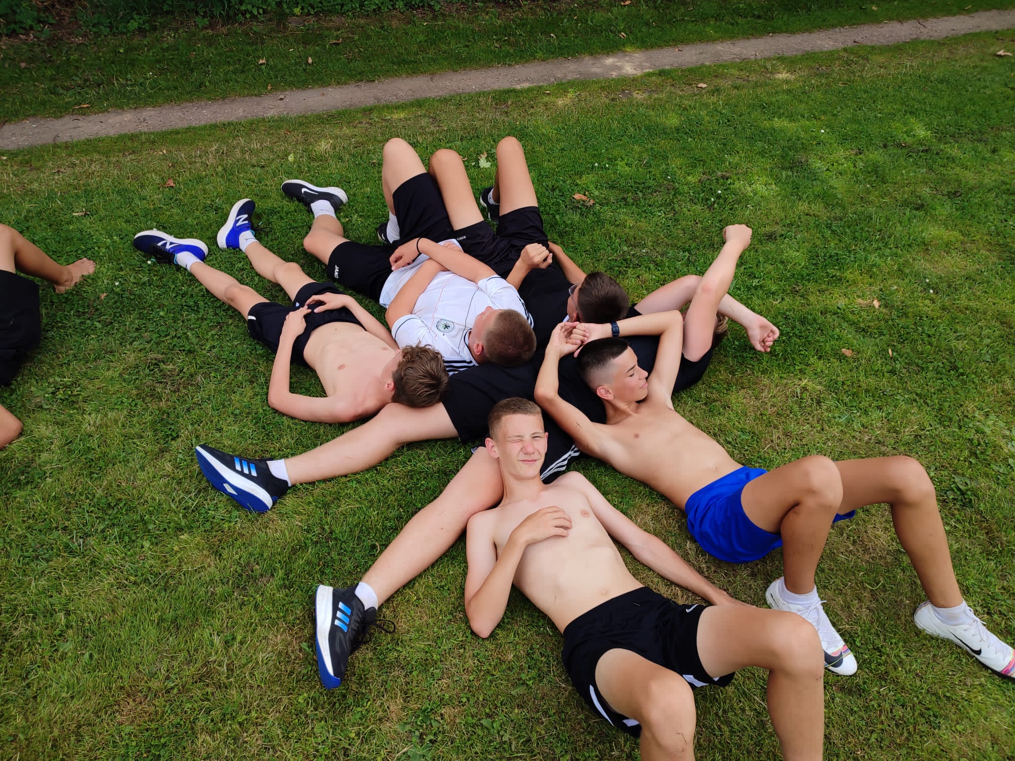 Heute Morgen wurden wir um 7:15 Uhr mit lauter Musik geweckt. Anschließend gab es leckeres Frühstück. Danach sind wir 10 Minuten mit dem Fahrrad auf eine große Wiese gefahren. Wir haben über den Vormittag einen Sportag gemacht. Hierbei haben wir Fußball, Völkerball und Minispiele gespielt! Das war lustig und schön. Als wir gegen 13:15 Uhr am Zeltplatz waren, gab es gleich Bauernfrühstück. Es hat sehr lecker geschmeckt.