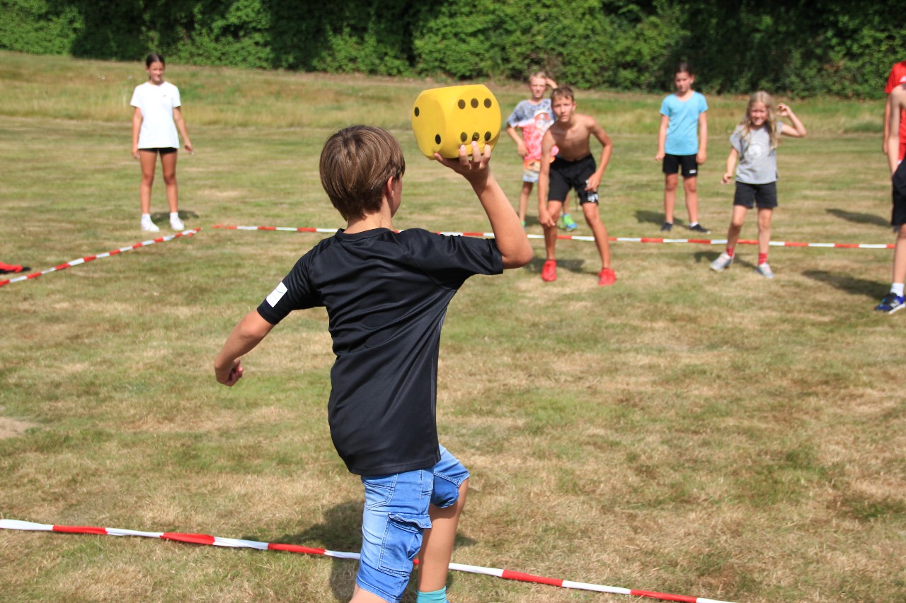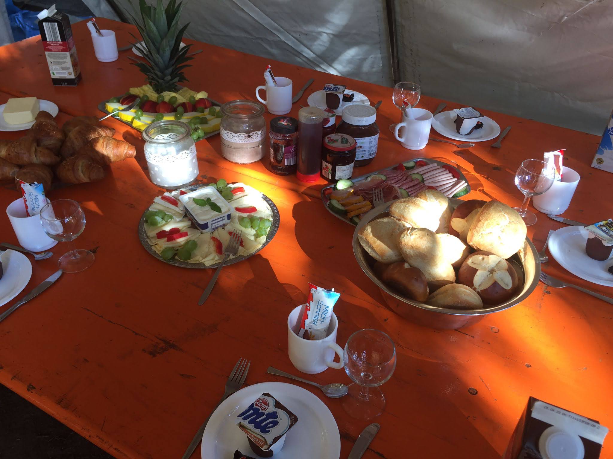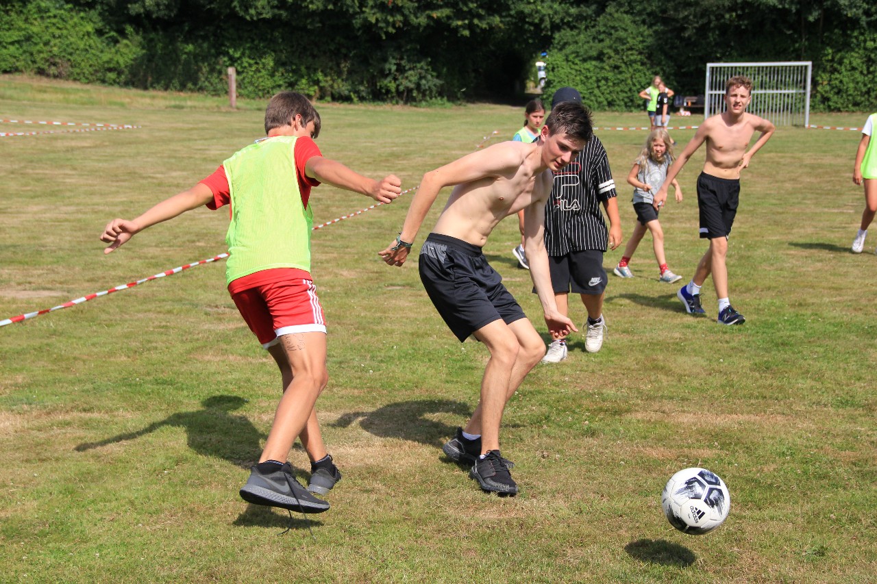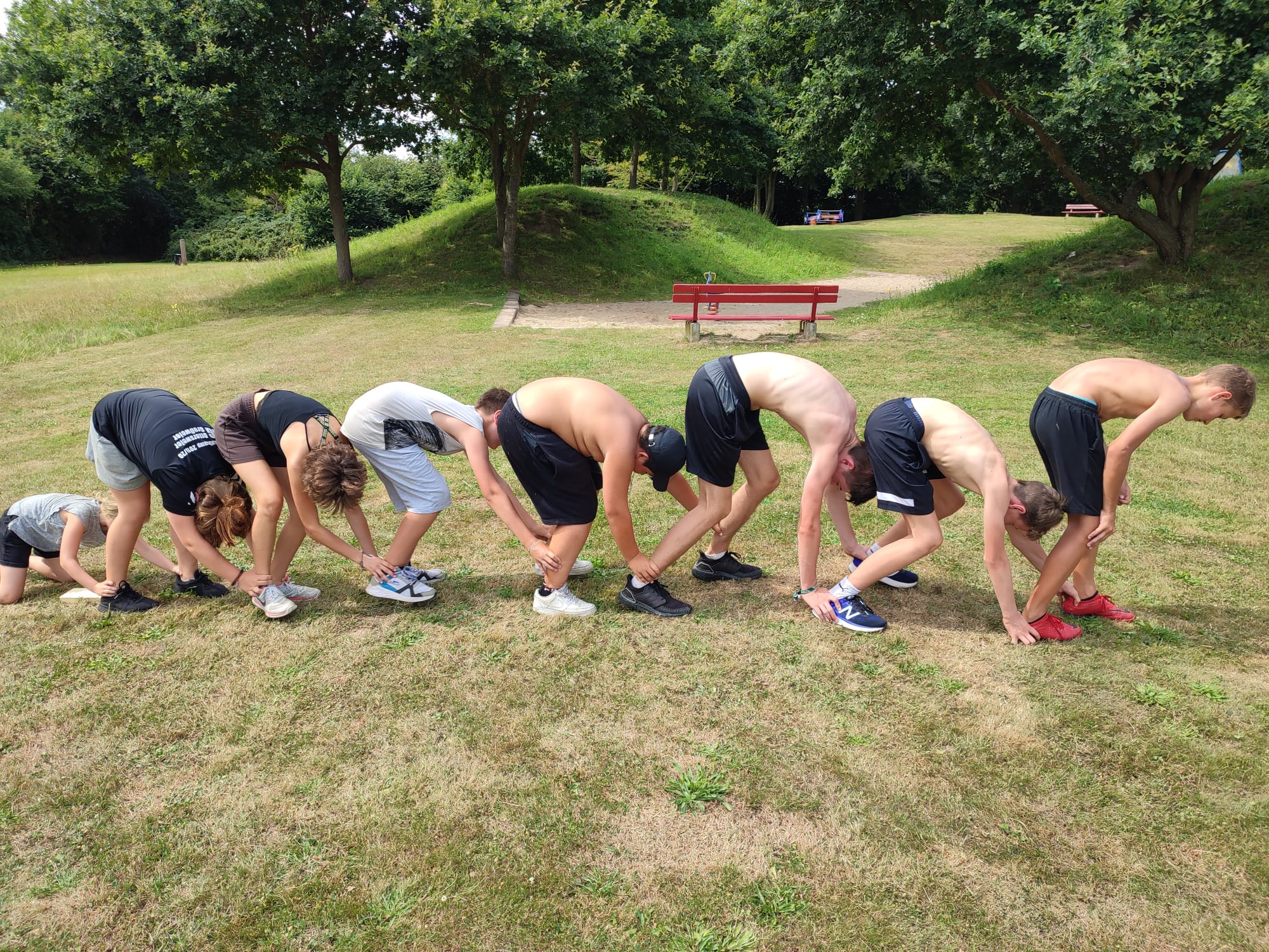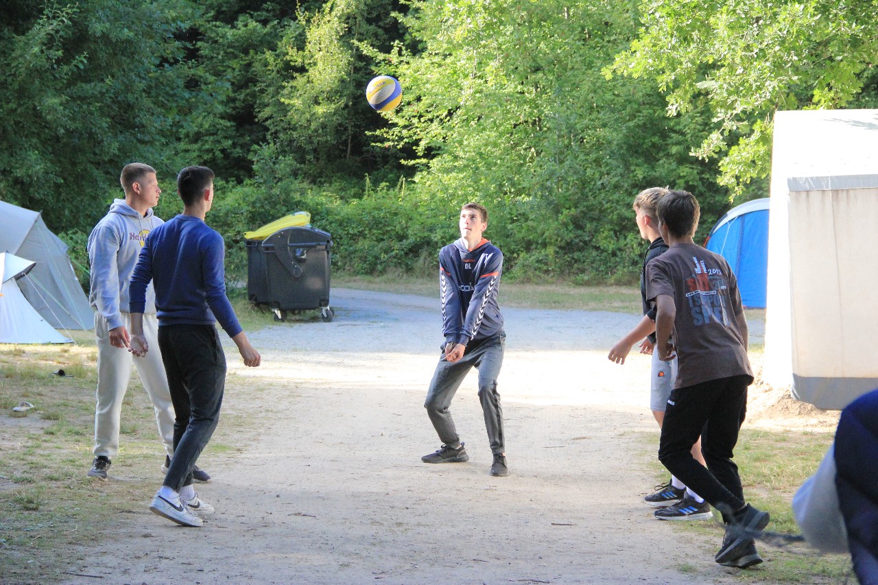 Heute Morgen wurden wir um 7:15 Uhr mit lauter Musik geweckt. Anschließend gab es leckeres Frühstück. Danach sind wir 10 Minuten mit dem Fahrrad auf eine große Wiese gefahren. Wir haben über den Vormittag einen Sportag gemacht. Hierbei haben wir Fußball, Völkerball und Minispiele gespielt! Das war lustig und schön. Als wir gegen 13:15 Uhr am Zeltplatz waren, gab es gleich Bauernfrühstück. Es hat sehr lecker geschmeckt.