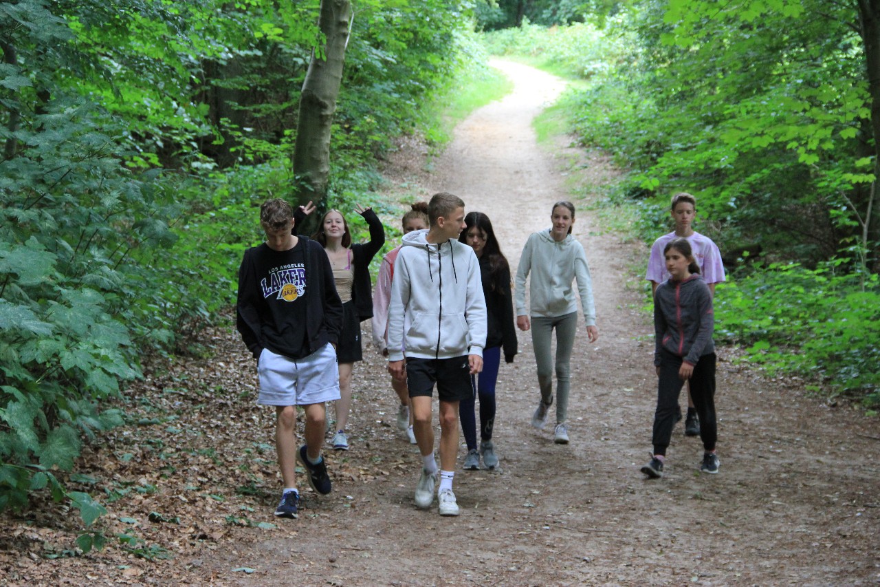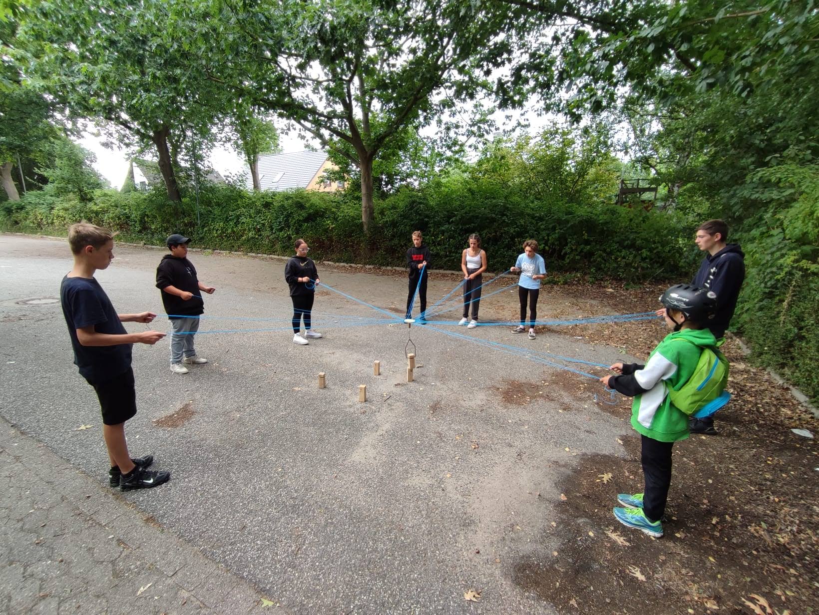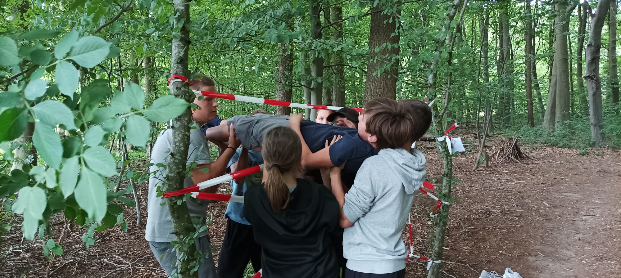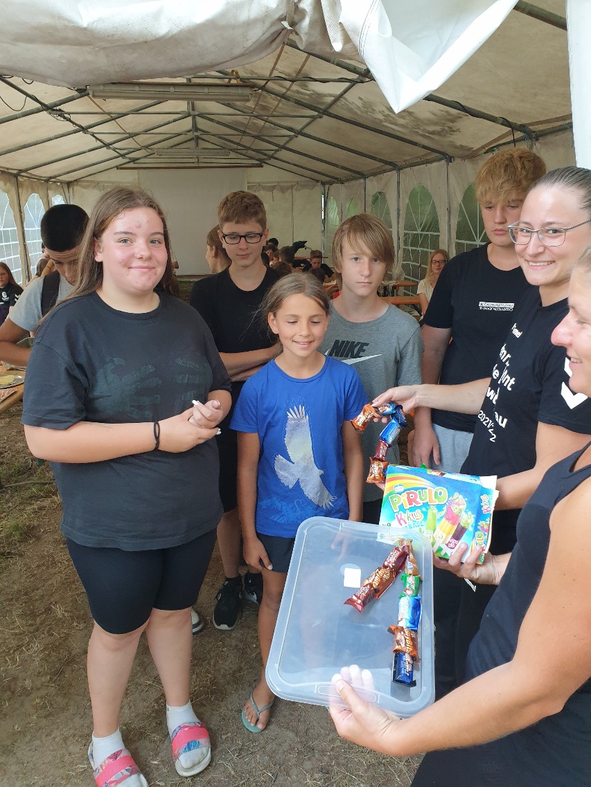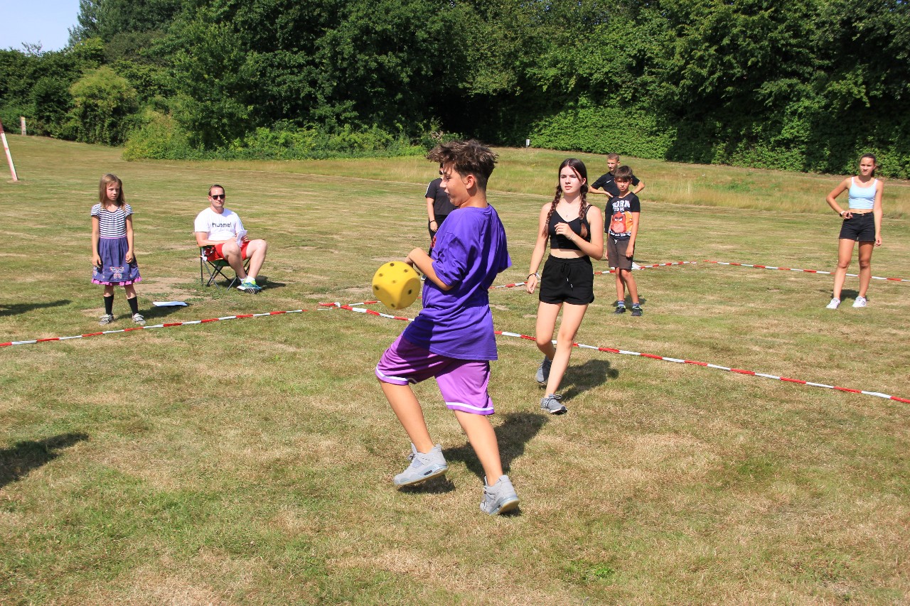 Heute Morgen wurden wir um 7:15 Uhr mit lauter Musik geweckt. Anschließend gab es leckeres Frühstück. Danach sind wir 10 Minuten mit dem Fahrrad auf eine große Wiese gefahren. Wir haben über den Vormittag einen Sportag gemacht. Hierbei haben wir Fußball, Völkerball und Minispiele gespielt! Das war lustig und schön. Als wir gegen 13:15 Uhr am Zeltplatz waren, gab es gleich Bauernfrühstück. Es hat sehr lecker geschmeckt.