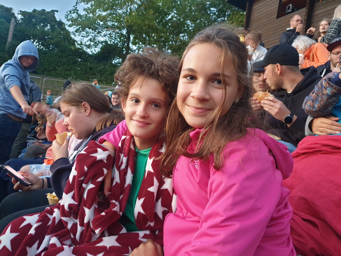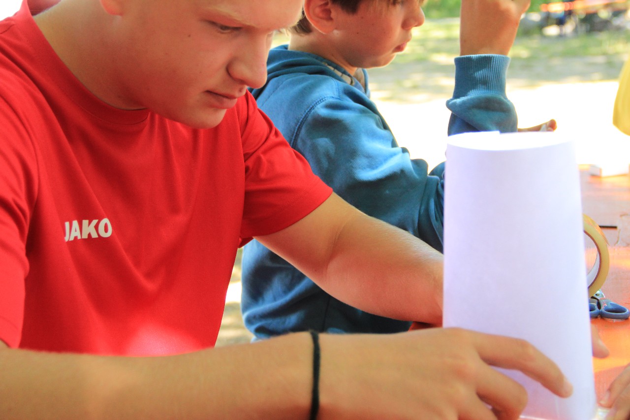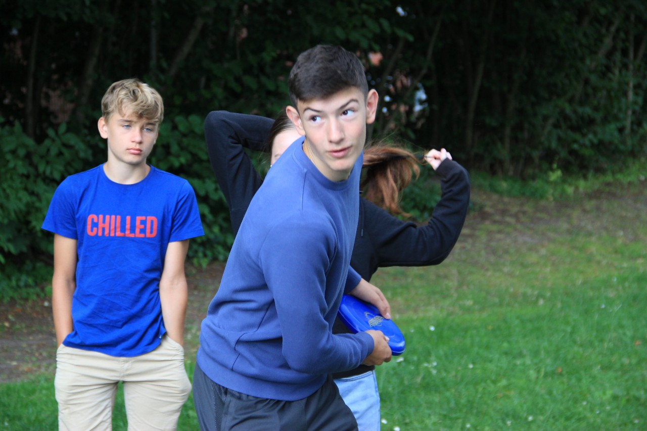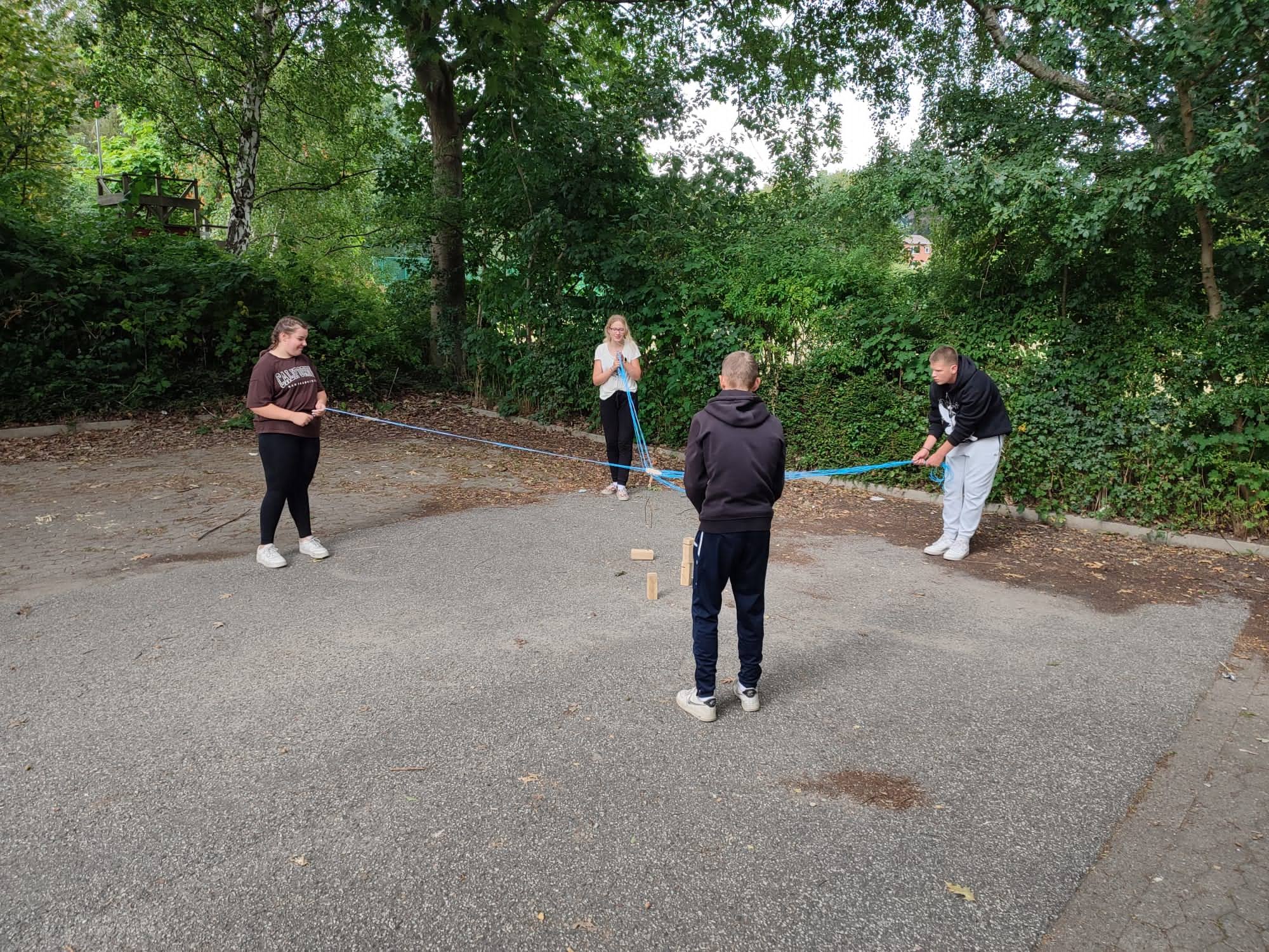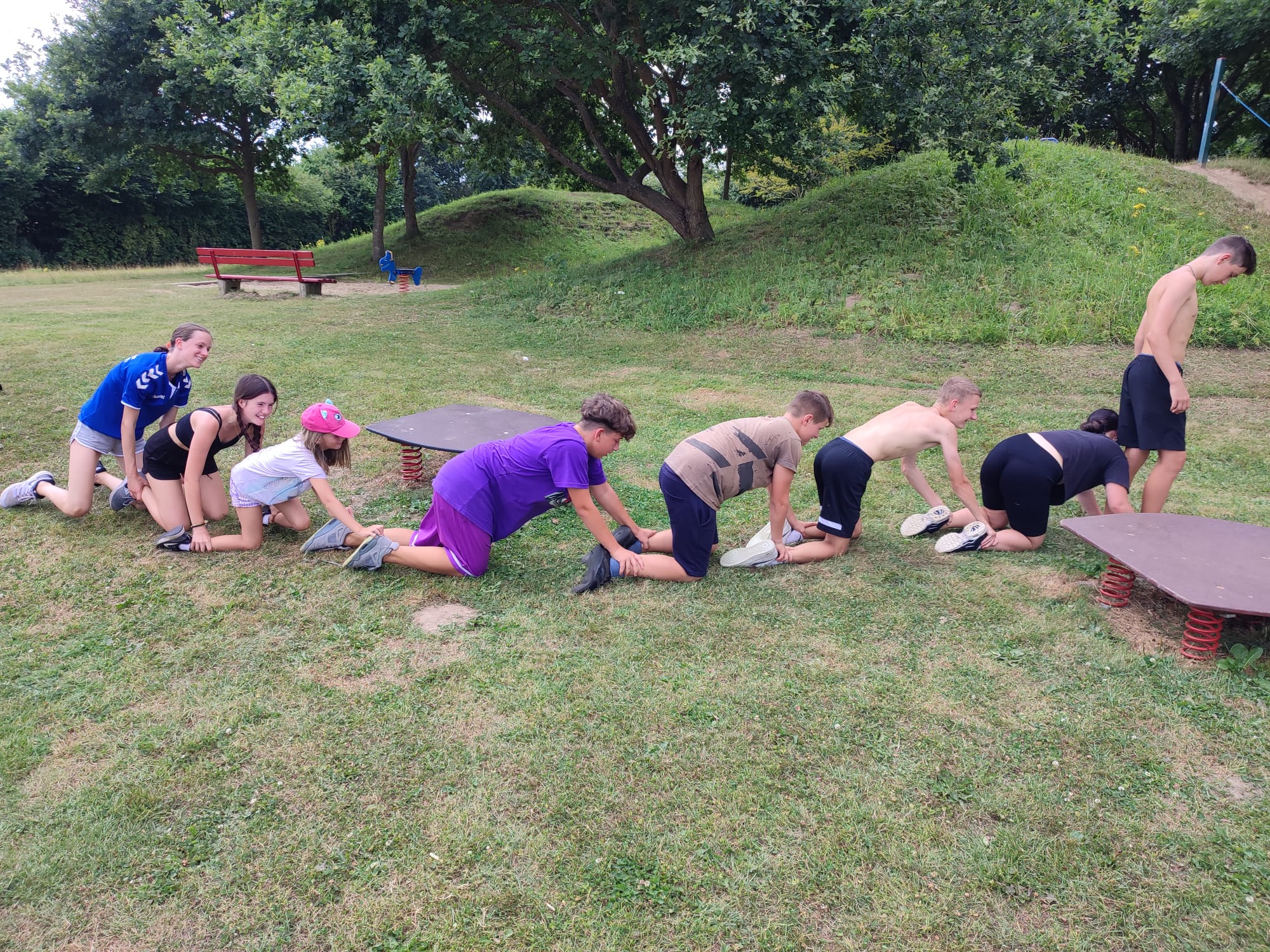 Heute Morgen wurden wir um 7:15 Uhr mit lauter Musik geweckt. Anschließend gab es leckeres Frühstück. Danach sind wir 10 Minuten mit dem Fahrrad auf eine große Wiese gefahren. Wir haben über den Vormittag einen Sportag gemacht. Hierbei haben wir Fußball, Völkerball und Minispiele gespielt! Das war lustig und schön. Als wir gegen 13:15 Uhr am Zeltplatz waren, gab es gleich Bauernfrühstück. Es hat sehr lecker geschmeckt.