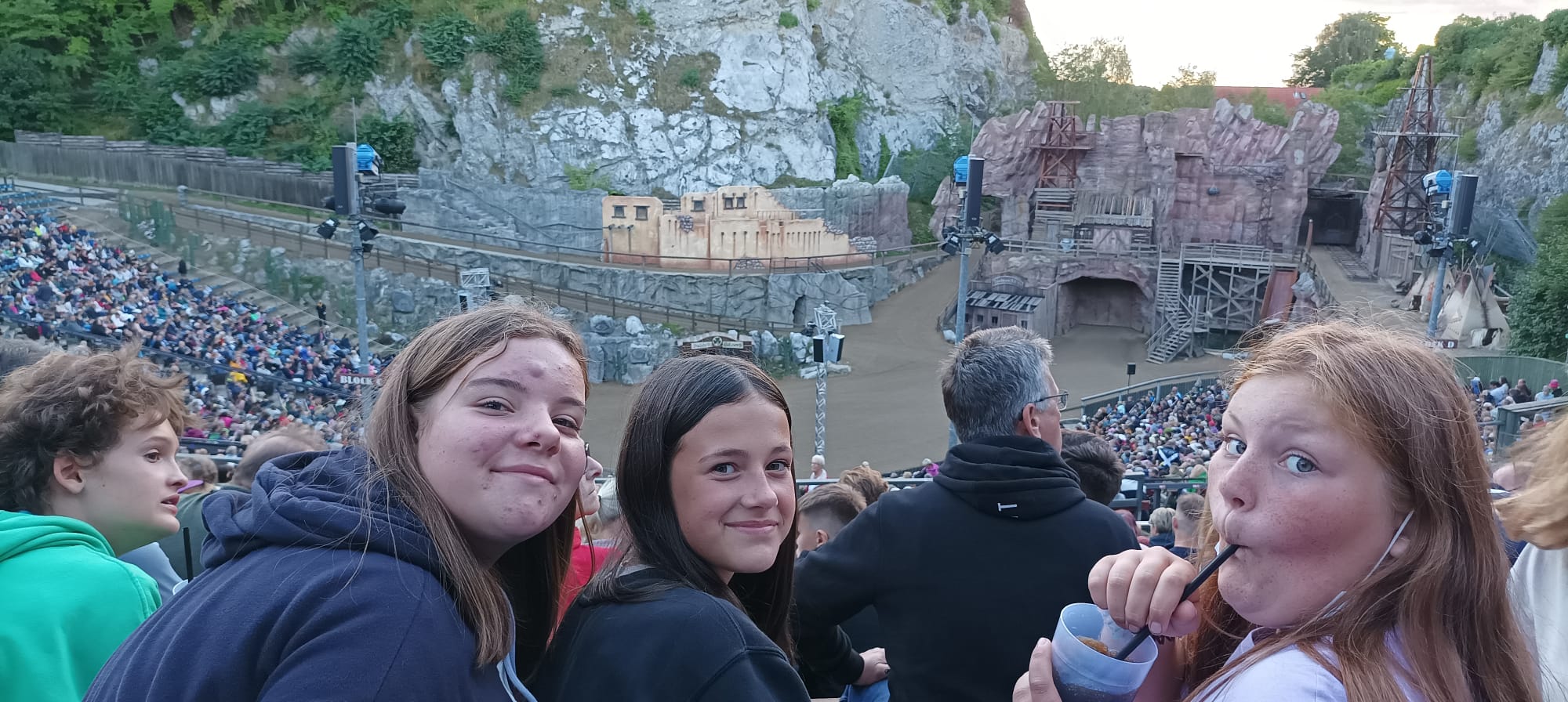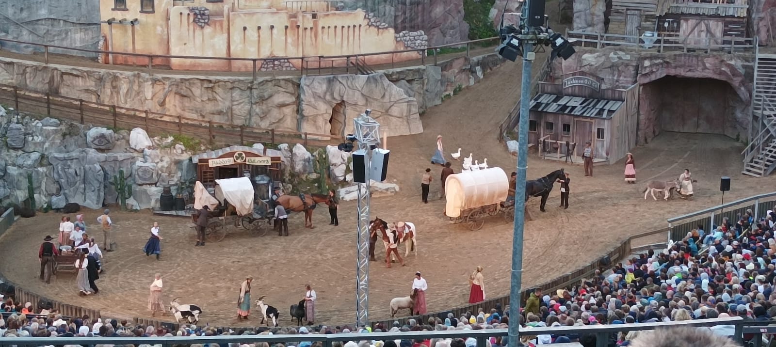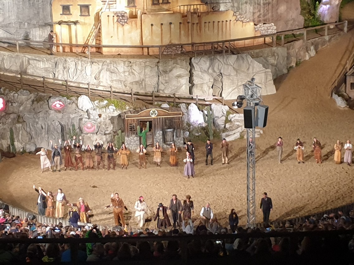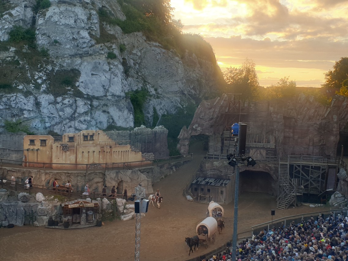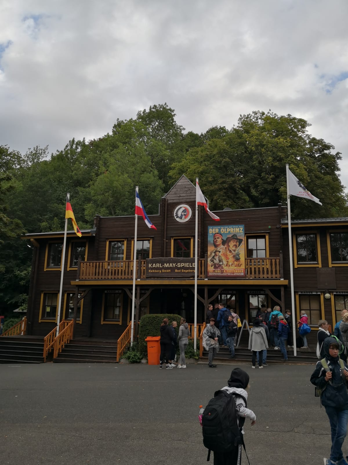 Wir wurden heute wieder von Musik geweckt. Dann sind wir zum Frühstück gegangen, wo wir dann das Spiel 44 Bäume angefangen haben. Das Spiel war für die Kleinen ein wenig schwierig und deshalb haben die Großen die Fragen beantwortet. Danach war Mittagessen und nachdem wir gegessen hatten sind wir mit der Fähre zum Kieler Hauptbahnhof gefahren, und von dort mit dem Zug nach Bad Segeberg zu den Karl-May Festspielen gefahren. Wir fanden das Feuer und die Explosionen gut, aber auch, dass Mr. Jackson am Anfang vom 5 m hohen Bohrturm in ein Haus gefallen ist.